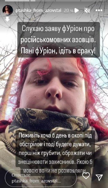 Захисниця "Пташка" і зовсім послала Фаріон з її заявами. На своїй сторінці в Instagram вона порадила мовознавиці провести хоча б один день в окопі, а потім міркувати на такі теми.