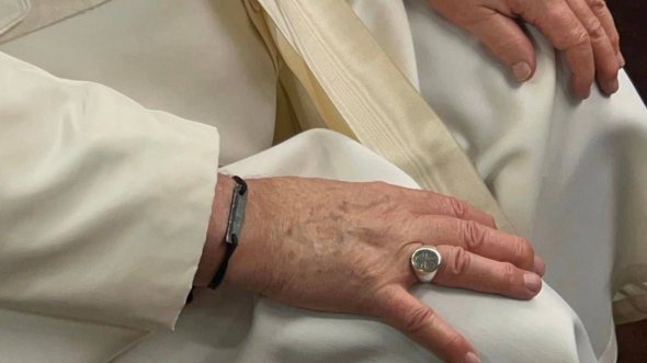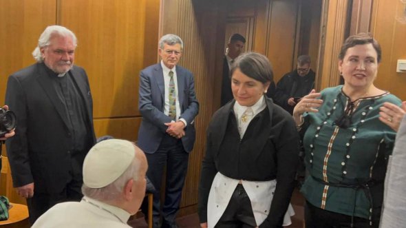 Понтифіку подарували символічні подарунки – прапор, врятований із знищеного села, пачку солі із останньої партії комбінату "Артемсіль" і браслет із металу з "Азовсталі".