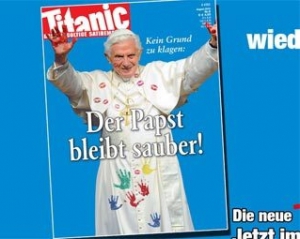 Німецький сатиричний журнал Titanic надрукував на обкладинці серпневого номера новий провокаційний колаж з фотографією папи Римського, пише dapd. На титульній сторінці зображений Бенедикт XVI зі слідами жіночих губ і відбитків рук на сутані. Руки самого папи забруднені в чомусь червоному.