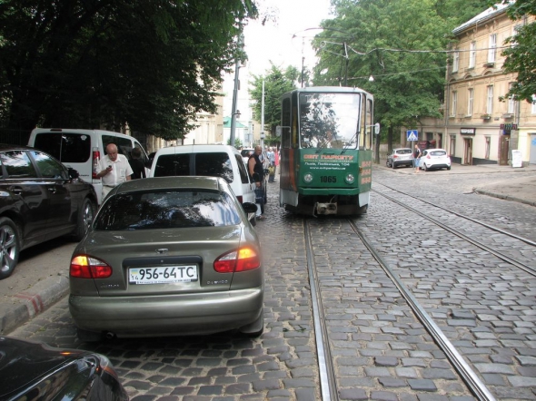 Сьогодні у Львові на вулиці Коперника водій трамваю тричі зупинявся через неправильно припарковані автомобілі.