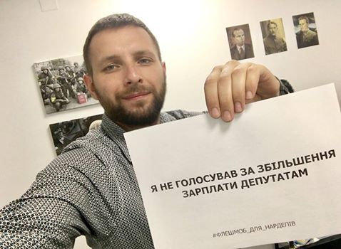 Нардеп Володимир Парасюк запустив у соцмережі Facebook флешмоб "Я НЕ ГОЛОСУВАВ за збільшення заробітної плати депутатам". Нагадаємо, народні депутати з 1 листопада підвищили собі заробітну плату. Тепер вона становитиме 25 "мінімалок", що дорівнює - 36 250 грн.