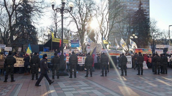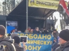 Присутні також тримають в руках прапори України і стукають по металевих бочках. Ще близько 200 осіб стоять під різними прапорами: "Фінансовий майдан", "Кредитний майдан", партій "Воля" і "5.10".