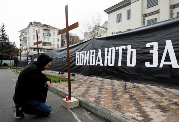 Національний корпус встановив біля посольства Росії у Києві десяток металевих хрестів, під якими запалив свічки. Так активісти вшанували пам'ять загиблих під час Голодомору.