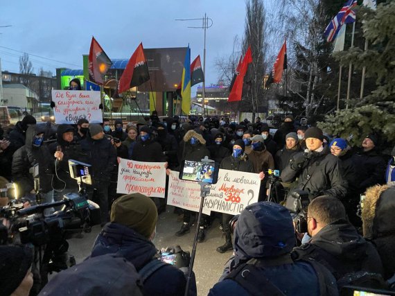 Учасники демонстрації хочуть домогтися закриття телеканалів. "Закрийте російську помийку", - вигукували пікетувальники.