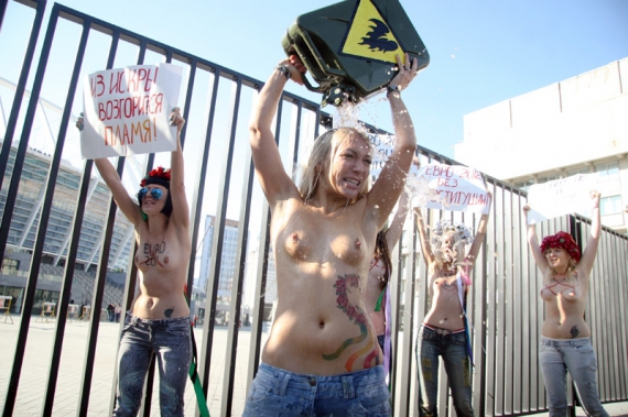Сьогодні під стінами НСК "Олімпійський" пройшла акція жіночого руху FEMEN. Напівоголені дівчата з плакатами "Євро 2012 — без проституції" обливали себе водою. Акція була приурочена до візиту президента УЄФА Мішеля Платіні.