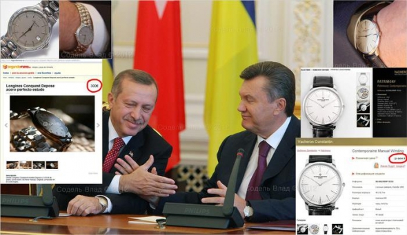 Платиновий годинник Vacheron Constantin у президента України Януковича,за ціною від 27 до 32 тисяч доларів, "розчавили" своїм авторитетом старенький кварцовий Longines Conquest L1.614.4 Реджепа Таїпа Ердогана, який прибув учора з візитом до столиці України. Про це повідомив на своїй сторінці в Facebook фотограф Влад Содель.