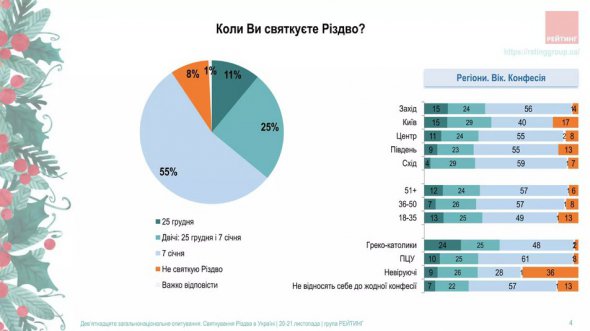 За рік зросла кількість українців, які святкують Різдво лише 25 грудня (з 4% до 11%). Також тих, хто відзначає свято в обидві дати (з 18% до 25%). Результати опитування опублікувала Соціологічна група "Рейтинг".