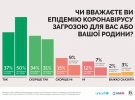 Понад дві третини - 71% - опитаних вважають пандемію загрозою для себе та своєї родини. Серед людей, старших від 60 років, цей показник вищий і становить 81%.