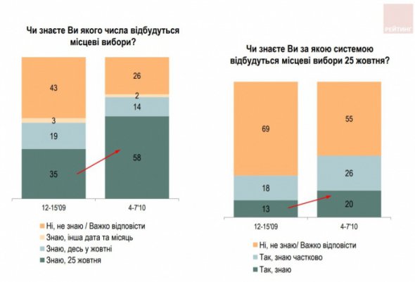 58% опитаних знають, що вибори відбудуться 25 жовтня, ще 14% відповіли, що вони будуть цього місяця, 2% назвали інший місяць і число, свідчать результати опитування соцгрупи "Рейтинг", проведеного 4-7 жовтня.