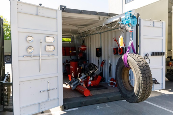 "Шиномонтаж - унікальний проєкт, який дозволяє повертати до життя і швидко перевзувати вантажівки та бойову техніку, зокрема КрАЗи, КаМАЗи, УРАЛи та Хамві. Загалом виготовили разом із харківськими партнерами 5 штук", - розповідає Порошенко.