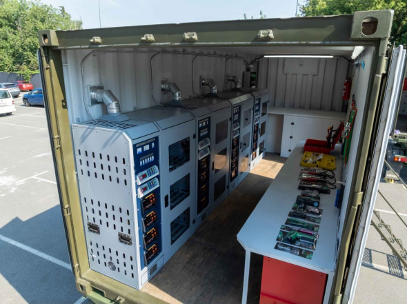 У липні цього року Порошенко також показав мобільну акумуляторну станцію, здатну одночасно заряджати більше десятка різних акумуляторів, зокрема й танкові. "Це велика зарядна станція, яка працює 24 години на добу абсолютно автономно. Вона може живити від 12 до 24 автомобільних акумуляторів різної потужності - байдуже, чи це буде пікап, танк або САУ", - пояснив Порошенко. Техніка вже надходить у бригади, зокрема, у підрозділи ССО.