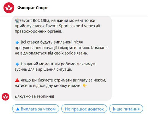 У компанії підтвердили інформацію про обшуки. Facebook-бот, налаштований консультувати користувачів, на запит про виплату показує повідомлення про те, що точки закриті через дії правоохоронців.
