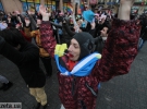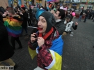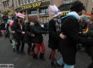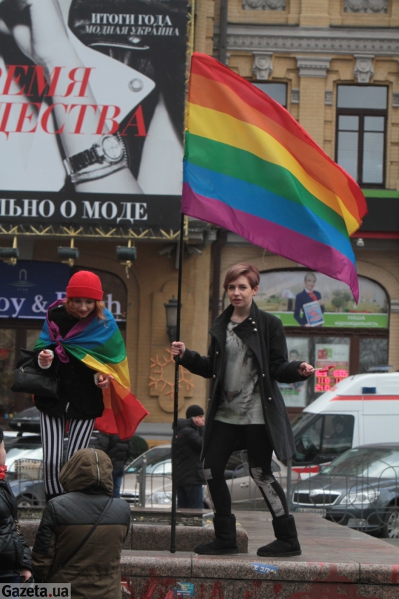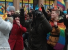 Близько 30 молодих людей під різнокольоровими прапорами зібралися на Бессарабській площі навпроти ринку. Вони близько години танцювали, а деякі з них намагалися пройти до барикад Євромайдану на розі Хрещатика і вулиці Богдана Хмельницького, передає УНІАН.