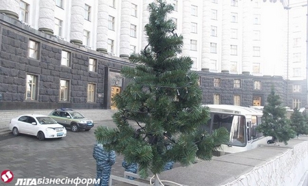 Перед будівлею Кабінету Міністрів, за яким стоять близько 10 міліцейських автобусів і кілька десятків міліціонерів, встановили 18 штучних ялинок.