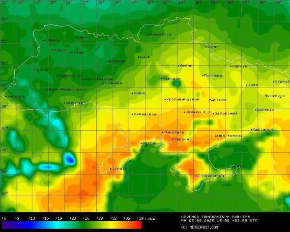 У вівторок, 5 серпня, в Україні температура повітря становитиме +24...29°С, у південній частині буде +30...34°С.