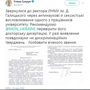 Звернулися до ректора ЛНМУ ім. Д. Галицького через антинаукові й сексистські висловлювання одного з працівників університету. Рекомендуємо @MON_UKRAINE перевірити його докторську дисертацію. У разі виявлення псевдонауки чи дискримінаційних тверджень - позбавити вченого звання. pic.twitter.com/L09EB9AQo1