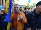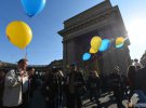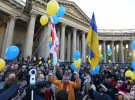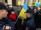 Жителі міста вийшли на акцію з жовто-блакитними прапорами, а також із шарфиками та стрічками в колір українського прапора, передає УНІАН.
