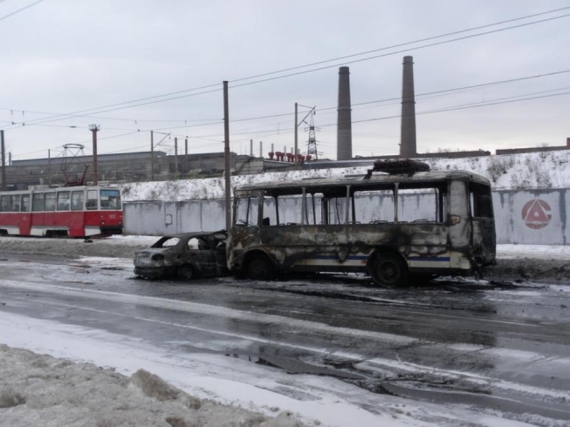 Пожежники, які прибули на місце події, змогли погасити вогонь через годину. Таксі та автобус згоріли вщент.