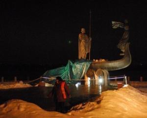 Фігури Щека й Хорива упали з постаменту головами вниз, лежать неподалік того фрагмента пам"ятника, який собою символізує човен.
