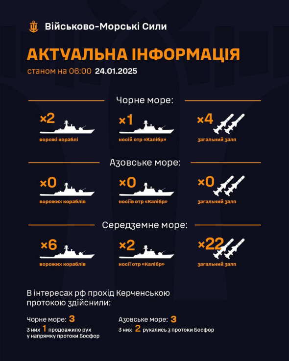 "В Азовському морі ворожі кораблі відсутні. У Середземному морі зараз шість ворожих кораблів, з яких два є носіями крилатих ракет "Калібр", загальним залпом до 22 ракет", - йдеться у повідомленні.