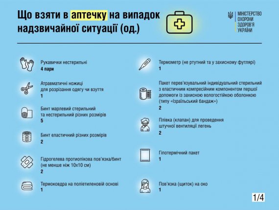 На випадок надзвичайної ситуації в аптечці, розрахованій на чотирьох осіб, мають бути: