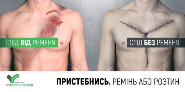 Соцреклама наголошує на смертельних наслідках автокатастроф, пропонуючи людям альтернативу, - синець від ременя у ДТП чи слід від ножа паталогоанатома.