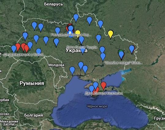 У мережі 27 грудня з'явилася карта, на якій відмічені офіси і будинки членів режиму Януковича.
