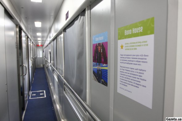 У другий вагон під назвою Bono House піднімаємося сходами із обтесаних пеньків. Сивоволосий провідник подає руку, щоб допомогти. У салоні прохолодно та пахне свіжістю. Вікна поїзду заклеєні спеціальною плівкою, щоб захистити людей від можливої вибухової хвилі. Такі заходи безпеки наразі в усіх потягах.
