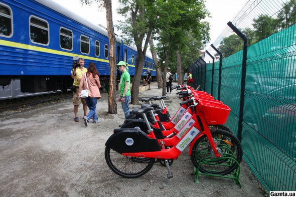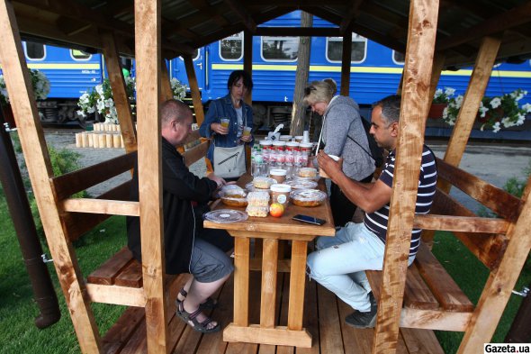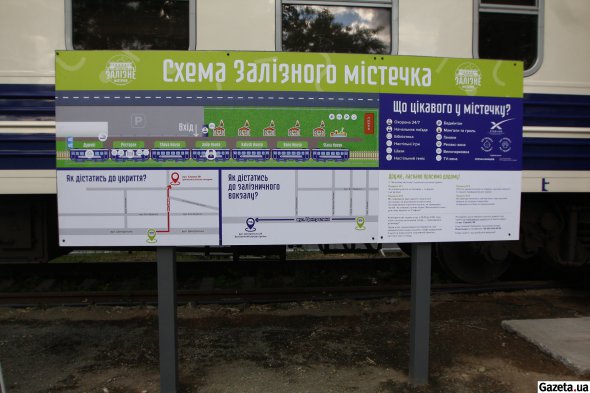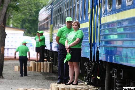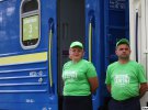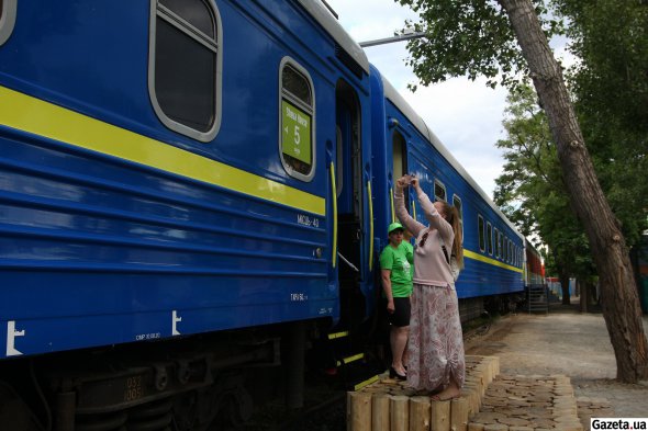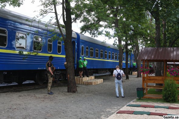 На колії у ряд вишикувалися сім вагонів, які надала Укрзалізниця. Розфарбовані у синьо-білі кольори, вони виглядають новими та охайними. Біля входу в кожен – провідники у салатових іменних футболках з фірмовою емблемою містечка.