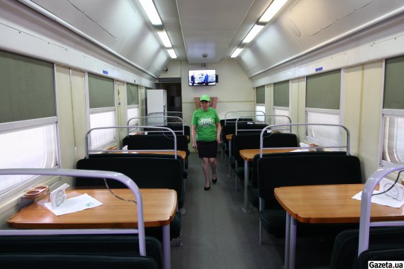 Барна стійка у вагоні-ресторані "причаїлась" у кутку приміщення. На стіні тихо працює плазмовий телевізор, під ним стоять полиці з книгами та різноманітними настільними іграми.