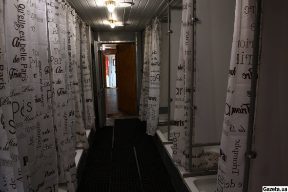 Заходимо у другі двері й потрапляємо у роздягальню з крючками на стінах та довгими дерев'яними лавами. За кімнатою розташовані душові кабіни у два ряди, прикриті шторками. На білих піддонах лежать гумові коврики.