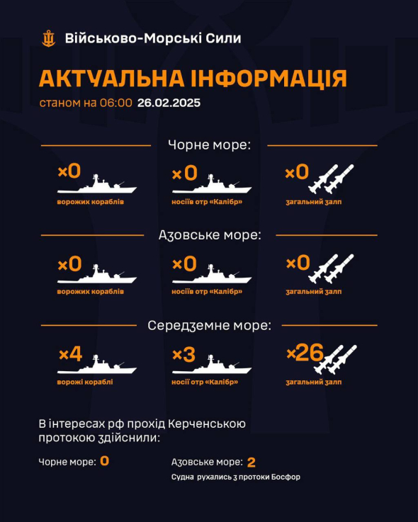 В Чорному морі зранку 26 лютого ворожі кораблі відсутні.