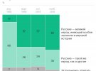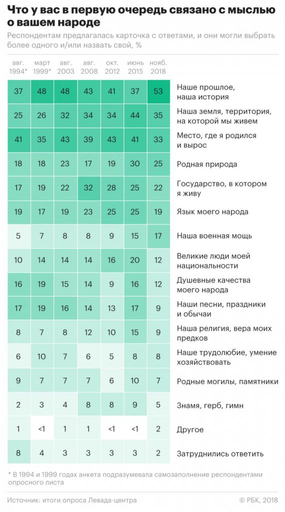 У першу чергу, з думкою про свій народ у росіян асоціюються спільна історія та минуле - 53%; 2017-го - 46%. Територія - 35%, місце народження - 33%, природа - 25% і держава - 22%.
