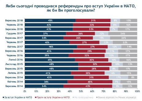На запитання, якби сьогодні проводився референдум про вступ України до НАТО, то "за" проголосували б 45% опитаних, а 31% виступили би "проти". Порівняно з груднем минулого року підтримка вступу до НАТО зросла на 8%.