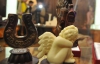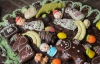 А у кінці зали майстриня Міла Закатова робила з шоколаду скульптуру у вигляді книги. На столі, за яким вона працювала, стояли вже готові витвори: Баба Яга в ступі, хатинка, череп, гральна кістка, тарілка з яблуком, половина якого справжня, та інші.