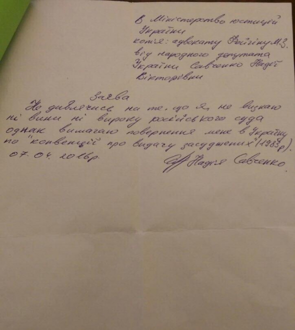 Українська льотчиця, депутат Верховної Ради від фракції "Всеукраїнське об'єднання" Батьківщина "Надія Савченко просить Міністерство юстиції почати процедуру її передачі Україні, згідно з конвенцією про видачу засуджених.