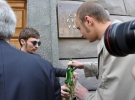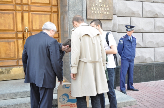 Активісти прямують до приймальні СБУ, що з іншого боку будівлі. Всередину їх пропускають одних. Виходять звідти за три хвилини. У руках тримають все ту саму коробку.