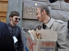 - Дивлячись на СБУшників, які на нас напали, ми помітили, що в них був досить жалюгідний вигляд, - пояснює Тицький. - Напевно, вони забрали ці листівки для того, щоби здати їх на макулатуру і заробити якихось грошей. Враховуючи, що СБУшники нам допомагають, ми вирішили їм допомогти матеріально. Тому принесли трохи макулатури і пляшки, які вони можуть здати, - розкриває коробку, показує — там багато картону, паперу та кілька порожніх пляшок від пива "Львівське", які вони зібрали на вулиці. - Сподіваюся, вони їх здадуть, зароблять собі якихось пару гривень, щоби не голодували.