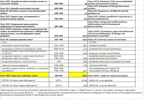 Від Covid-19 померли 6936 осіб, що відповідає третій позиції в переліку причин смертності українців. Водночас від хвороб органів дихання, зокрема грип і пневмонію, померли 3457 людей.