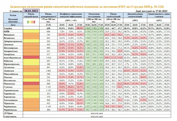 Станом на 28 січня в Україні в червоній зоні карантину перебувають Івано-Франківська й Рівненська області.