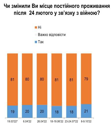 Дещо зросла й кількість респондентів, які змушені були покинути місце постійного проживання після 24 лютого. Ріст відбувається внаслідок зростання кількості внутрішньо переміщених осіб зі східних і південних регіонів.