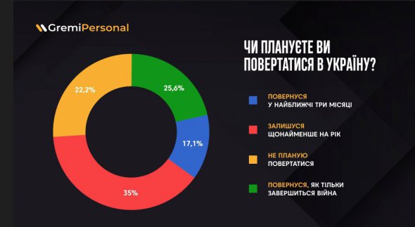 "Ми прогнозуємо, що більшість українців повернуться на батьківщину, щойно мине небезпека. Однак значна частина залишиться за кордоном за низкою суб'єктивних чинників: утрата житла, низький рівень оплати праці, кращі умови проживання і, звісно, через те, що немає ризиків для життя", – заявила директорка департаменту рекрутації Gremi Personal Ганна Джоболда.