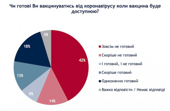 42% українців не готові вакцинуватися проти Covid-19, навіть коли вакцина стане доступною. При цьому 18% опитаних однозначно готові отримати щеплення.
