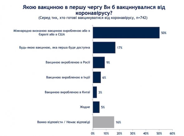 Серед осіб, які хочуть отримати Covid-щеплення, 50% віддають перевагу вакцинам, виготовленим у Європі або США. При цьому 17% готові вакцинуватися будь-якою доступною вакциною. Найменше опитані довіряють препаратам, виробленим в Індії та Китаї.
