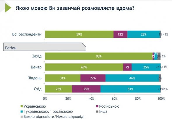 В Україні 59% опитаних респондентів розмовляють українською мовою вдома, а 28% - і українською, і російською.