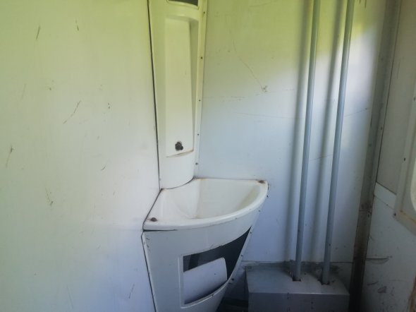 Двері в туалет заклеєні плівкою, вони не зачиняються. Усередині - іржаві труби, брудний залізний умивальник. Сморід розлітається на весь вагон. Поряд, у тамбурі, курять чоловіки з пивом у руках.