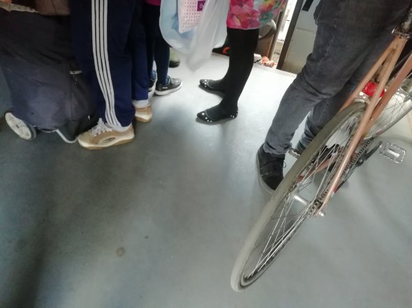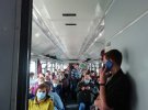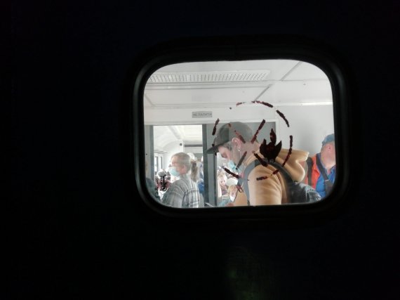 У тамбурі одночасно тхне сигаретним димом, брудними шкарпетками і пиріжками з м'ясом. До стін туляться пасажири, яким не вистачило місць у салоні. Чимало народу стоїть у проходах між сидіннями. Більшості за 40 років, переважно без захисних масок. До Фастова везуть придбані на київських ринках рослини, їжу, техніку.