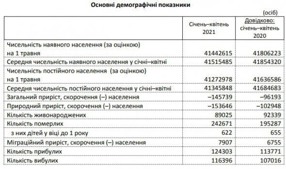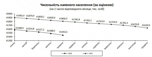 За оцінюванням статистичного відомства, чисельність наявного населення в Україні станом на 1 травня 2021-го становила 41 442 615 осіб. З початку 2021 року населення країни скоротилося на 145 739 осіб.