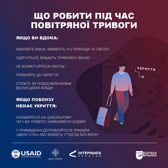 Швидко одягніться, візьміть тривожну валізу з необхідними речами. Прямуйте до укриття, стежте за повідомленнями від місцевої влади і правоохоронців.