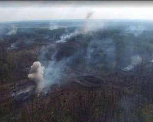На оприлюднених кадрах видно відразу кілька вогнищ пожежі і великі ділянки вигорілого лісу.